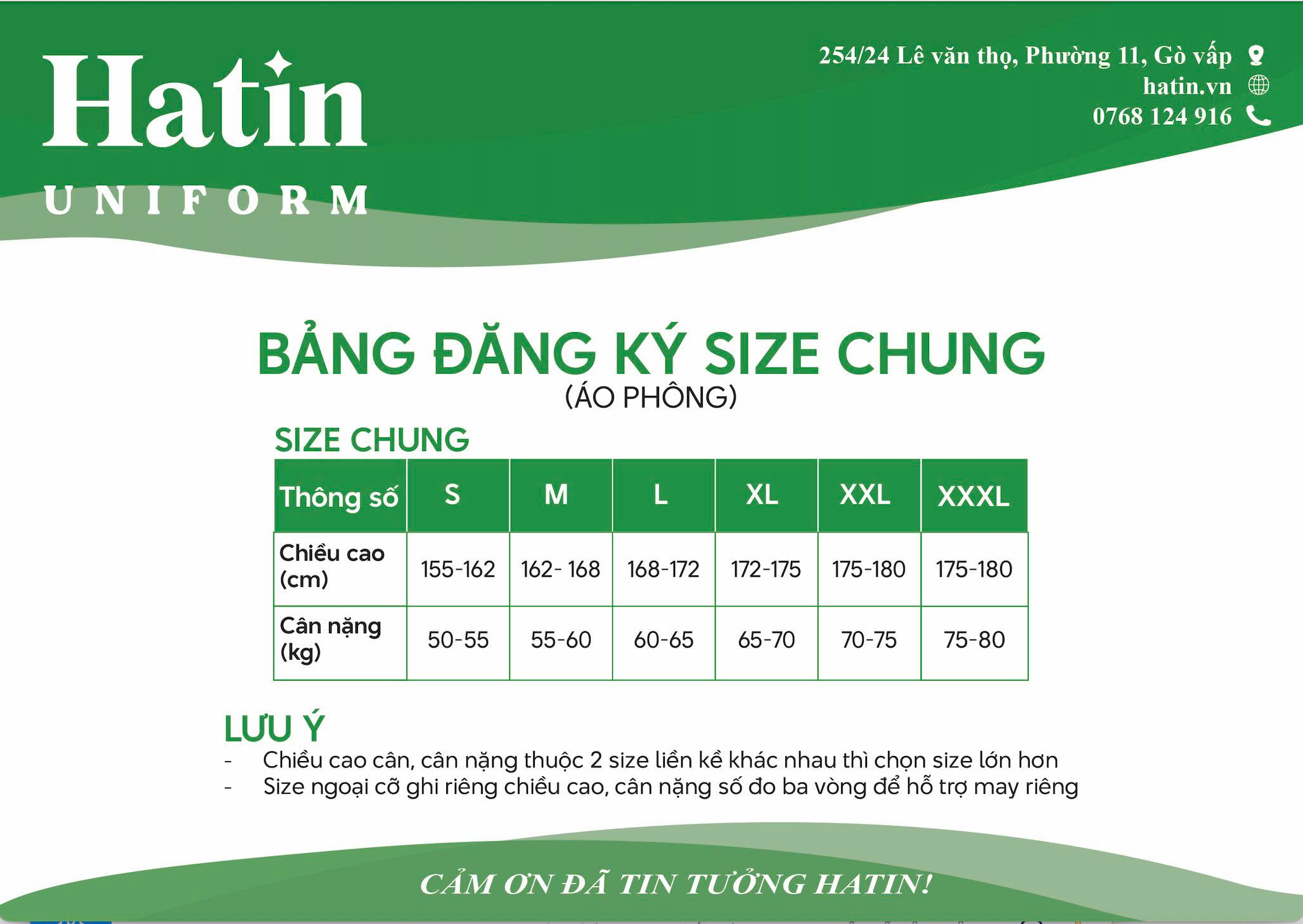 Tại xưởng Hatin, chúng tôi cung cấp bảng size áo đồng phục chi tiết để đảm bảo rằng mọi nhân viên đều có thể chọn được kích thước phù hợp. Bảng size bao gồm các kích cỡ từ S, M, L, XL, đến XXL với các số đo cụ thể cho vòng ngực, vòng eo và chiều dài áo. Chúng tôi cam kết mang đến sự vừa vặn hoàn hảo cho người mặc nhờ vào quy trình đo lường và kiểm tra chất lượng nghiêm ngặt.