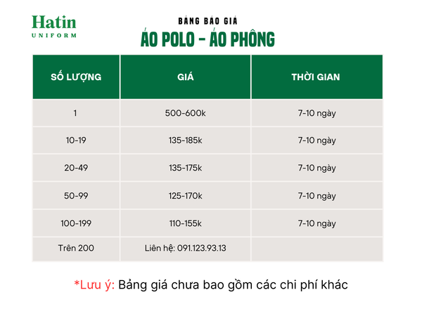 Tại xưởng Hatin, bảng báo giá đồng phục áo polo được thiết lập dựa trên nhiều yếu tố, bao gồm số lượng đặt hàng, chất liệu vải, và các tùy chọn in ấn hoặc thêu logo. Giá cơ bản cho áo polo bắt đầu từ mức cạnh tranh với sự điều chỉnh linh hoạt tùy theo yêu cầu cụ thể của khách hàng.